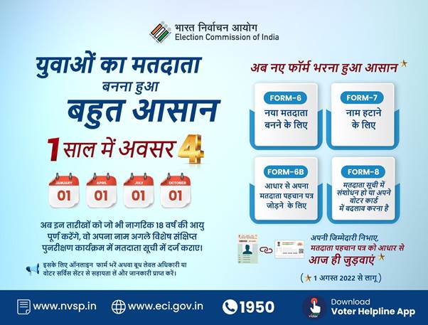 नईदिल्ली,28 जुलाई (आरएनएस)। 17+ वर्ष के युवा अब मतदाता सूची में अपना नाम दर्ज कराने के लिए अग्रिम रूप से आवेदन कर सकते हैं और इसके लिए उन्हें किसी वर्ष की 1 जनवरी को 18 वर्ष की आयु प्राप्त करने के पूर्वापेक्षित मानदंड की प्रतीक्षा करने की आवश्यकता नहीं है। मुख्य निर्वाचन आयुक्त राजीव कुमार और निर्वाचन आयुक्त अनूप चंद्र पाण्डेय के नेतृत्व में भारतनिर्वाचन आयोग ने सभी राज्यों के मुख्य निर्वाचन अधिकारियों (सीईओ)/निर्वाचक रजिस्ट्रीकरण अधिकारियों (ईआरओ)/सहायक निर्वाचक रजिस्ट्रीकरण अधिकारियों (एईआरओ) को इस तरह के प्रौद्योगिकी-सक्षम समाधान तैयार करने के निर्देश दिए हैं कि युवाओं को न केवल 1 जनवरी को बल्कि तीन पश्चातवर्ती अर्हक तिथियों अर्थात 01 अप्रैल, 01 जुलाई और 01 अक्टूबर के संदर्भ में भी अपने अग्रिम आवेदन दाखिल करने की सुविधा मिल सके। अब से, निर्वाचक नामावली प्रत्येक तिमाही में अद्यतन की जाएगीऔर पात्र युवाओं को उस वर्ष की अगली तिमाही में पंजीकृत किया जा सकता है जिसमें उन्होंने 18 वर्ष की पात्रता आयु पूरी कर ली हो। पंजीकरण करवाने के बाद उन्हें निर्वाचक फोटो पहचान पत्र (एपिक) जारी किया जाएगा। निर्वाचक नामावली, 2023 के वार्षिक पुनरीक्षण के चालू राउंड के लिएवर्ष 2023 के 1 अप्रैल, 1 जुलाई और 1 अक्टूबर तक 18 वर्ष की आयु प्राप्त करने वाला कोई भी नागरिक मतदाता के रूप में पंजीकरण के लिए निर्वाचक नामावली के प्रारूप प्रकाशन की तारीख से अग्रिम आवेदन जमा कर सकता है।