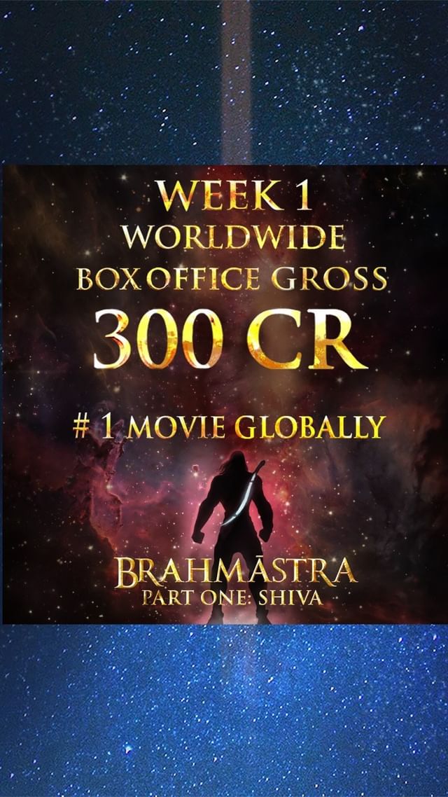 रणबीर कपूर और आलिया भट्ट की ब्रह्मास्त्र आलोचकों की प्रतिक्रिया और ट्रोलिंग के बाद भी बॉक्स ऑफिस पर छाई हुई है। फिल्म बॉक्स ऑफिस पर लगातार नए-नए रिकॉर्ड दर्ज कर रही है। अपने ओपनिंग वीकेंड में ही फिल्म 100 करोड़ के क्लब में शामिल हो गई थी। वहीं अब नए आंकड़ों के मुताबिक फिल्म ने पहले हफ्ते में दुनियाभर में करीब 300 करोड़ रुपये का कलेक्शन कर लिया है और ग्लोबल बॉक्स ऑफिस पर टॉप पर रही। फिल्म के निर्माता करण जौहर ने सोशल मीडिया पर जानकारी दी कि फिल्म ने पहले हफ्ते में 300 करोड़ रुपये की कमाई की है। उन्होंने अपने ट्वीट में लिखा, प्यार और रोशनी ग्लोबल बॉक्स ऑफिस पर प्त1 पर राज कर रहे हैं। दूसरे हफ्ते में प्रवेश करते हुए हमारा दिल कृतज्ञता और उत्साह से भरा है। बता दें कि फिल्म ने अपने पहले वीकेंड में ही दुनियाभर में 225 करोड़ रुपये का कलेक्शन कर लिया था। भारतीय बॉक्स ऑफिस की बात करें तो देश में भी फिल्म का शानदार कलेक्शन जारी है। रिपोर्ट के अनुसार फिल्म ने पहले हफ्ते में देश में करीब 165 करोड़ रुपये कमाए हैं। फिल्म ने अपने पहले वीकेंड पर करीब 125 करोड़ रुपये की कमाई की थी। वहीं पहले दिन फिल्म ने 36 करोड़ रुपये बटोरे थे। अडवांस बुकिंग के जरिए फिल्म रिलीज से पहले ही करीब 28 करोड़ रुपये कमा चुकी थी। ब्रह्मास्त्र ग्लोबल बॉक्स ऑफिस पर टॉप करने वाली चुनिंदा भारतीय फिल्मों में शामिल हो गई है। भारत में यह इस साल पहले दिन सबसे ज्यादा कमाई करने वाली फिल्म बन गई है। फिल्म ने भूल भुलैया 2 के पहले दिन के कलेक्शन को पीछे छोड़कर यह स्थान हासिल किया। फिल्म पहले हफ्ते में 100 करोड़ क्लब में शामिल होने वाली चंद फिल्मों में शामिल हो गई। यह रणबीर कपूर की अब तक की सबसे बड़ी ओपनिंग वीकेंड वाली फिल्म है। ब्रह्मास्त्र निर्देशक अयान मुखर्जी का ड्रीम प्रोजेक्ट है। वह लंबे समय से इस फिल्म को बना रहे थे। सालों की मेकिंग के बाद यह फिल्म बीते 9 सितंबर को रिलीज हुई थी। फिल्म में रणबीर और आलिया के साथ अमिताभ बच्चन, शाहरुख खान, नागार्जुन और मौनी रॉय जैसे कलाकार नजर आए। हाल ही में अयान ने बताया कि वह फिल्म का अगला भाग 2025 में रिलीज करने की उम्मीद कर रहे हैं। ब्रह्मास्त्र की कहानी तीन भागों में आएगी। ब्रह्मास्त्र 2 में देव और अमृता की कहानी होगी। जहां अमृता का किरदार में दीपिका पादुकोण के होने की चर्चा है, वहीं दर्शक देव के लिए रणवीर सिंह और ऋतिक रोशन के नाम के कयास लगा रहे हैं।