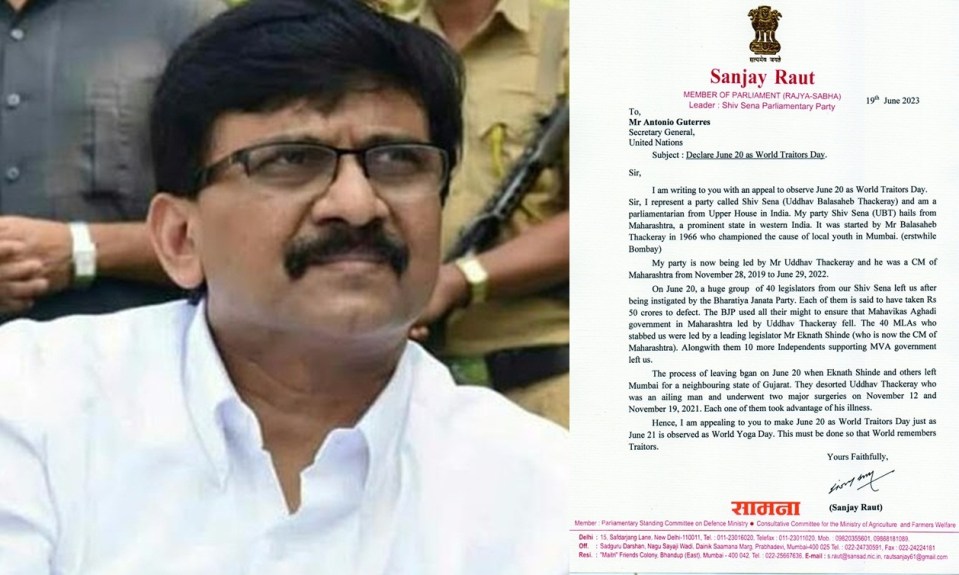 राउत ने इस मुद्दे को आगे बढ़ाते हुए संयुक्त राष्ट्र महासचिव एंटोनियो गुटेरेस को एक पत्र लिखकर अपील की कि 20 जून को ‘विश्व गद्दार दिवस’ घोषित किया जाना चाहिए। इसी दिन 2022 में शिंदे गुट मूल शिवसेना से बाहर चला गया था। राउत ने इस अजीबो-गरीब मांग के साथ संयुक्त राष्ट्र को घटना की पूरी पृष्ठभूमि भी बताई है।