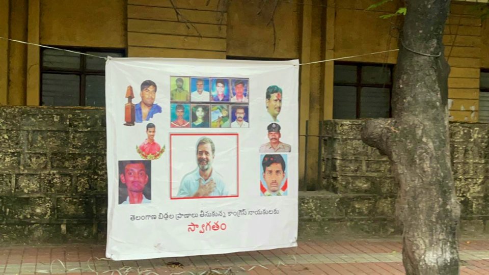 हैदराबाद हवाईअड्डे के पास लगाए गए एक पोस्टर में लिखा है, ”तेलंगाना के बेटों की जान लेने वाले कांग्रेस नेताओं का स्वागत है।”