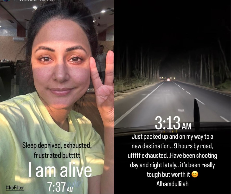 हिना ने सुबह 3.13 बजे के टाइम स्टैम्प के साथ लिखा, ”बस पैकअप कर लिया है और रोड से एक नए डेस्टिनेशन की ओर जा रही हूं, जो नौ घंटे का सफर है। उफ्फ! थक गयी… हाल ही में दिन-रात शूटिंग कर रही हूं… यह सच में बहुत मुश्किल है लेकिन मजेदार है।”