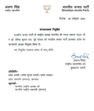 नई दिल्ली, 26 अक्टूबर। झारखंड में विधानसभा चुनाव को लेकर चल रहे चुनाव प्रचार अभियान के बीच भाजपा ने प्रदेश संगठन में अहम बदलाव की घोषणा की है। पार्टी आलाकमान ने शनिवार को पूर्व सांसद डॉ. रविंद्र कुमार राय को झारखंड प्रदेश भाजपा का कार्यकारी अध्यक्ष नियुक्त किया। पार्टी के राष्ट्रीय महासचिव एवं मुख्यालय प्रभारी अरुण सिंह ने झारखंड भाजपा प्रदेश संगठन में इस संगठनात्मक नियुक्ति को लेकर पत्र जारी कर बताया, “भारतीय जनता पार्टी के राष्ट्रीय अध्यक्ष जगत प्रकाश नड्डा ने पूर्व सांसद डॉ. रवींद्र कुमार राय को भारतीय जनता पार्टी झारखंड प्रदेश का कार्यकारी अध्यक्ष नियुक्त किया है। यह नियुक्ति तत्काल प्रभाव से लागू होगी।” आपको बता दें कि, रविंद्र कुमार राय झारखंड भाजपा के कद्दावर नेता माने जाते हैं। वह झारखंड से विधायक, सांसद और राज्य सरकार में मंत्री भी रह चुके हैं। बताया जा रहा है कि उन्हें झारखंड भाजपा का कार्यकारी अध्यक्ष नियुक्त कर, पार्टी आलाकमान ने उनके समर्थक कार्यकर्ताओं और मतदाताओं के साथ-साथ संगठन के पुराने दिग्गज नेताओं को भी राजनीतिक संदेश देने का प्रयास किया है।