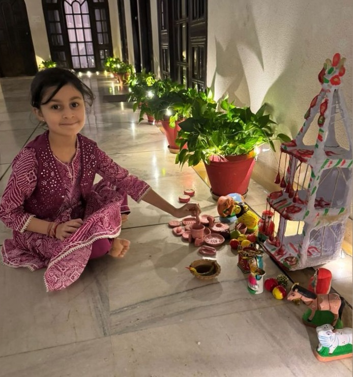 नितिन मुकेश ने इंस्टाग्राम स्टोरी पर अपनी पोती की एक तस्वीर साझा की जिसमें नूरवी भारतीय पारंपरिक कपड़े पहनकर जमीन पर बैठी दिख रही हैं और मिट्टी के छोटे-छोटे दीए सजा रही हैं। इस फोटो के साथ उन्होंने लिखा, ”दादू की लाडली नूरवी, घरौंदा पूजन करती हुई।” इस तस्वीर में नूरवी की मासूमियत हर किसी के चेहरे पर मुस्कान ला रही है। इस पोस्ट को अभिनेता नील नितिन मुकेश ने अपनी इंस्टाग्राम स्टोरी पर री-शेयर किया है। घरौंदा पूजन देवी लक्ष्मी और भगवान गणेश की पूजा का प्रतीक है, जिसमें मिट्टी के घर बनाकर उन्हें दीयों, रंगोली और फूलों से सजाया जाता है, और इस तरह समृद्धि, सौभाग्य और एकजुटता की कामना की जाती है।