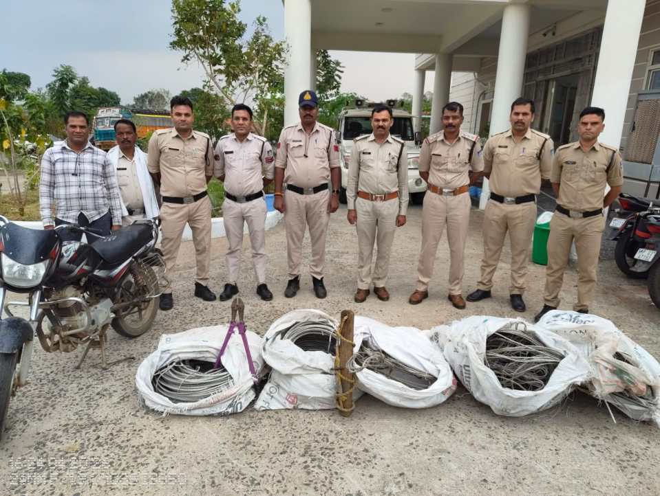 पुलिस ने आरोपियों की निशानदेही पर चोरी में प्रयुक्त झूला, तार कटर, मोटरसाइकिल एवं पांच बोरियों में भरे एल्युमिनियम बिजली तार के बंडल जब्त किए हैं।
